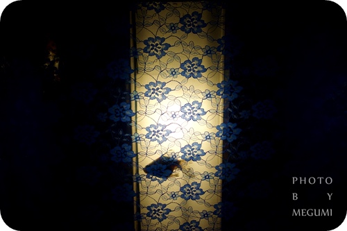 高低錯落的魚缸與座座光柱,柱前貼有透明蕾絲花樣、柱後光線洋溢朦朧感