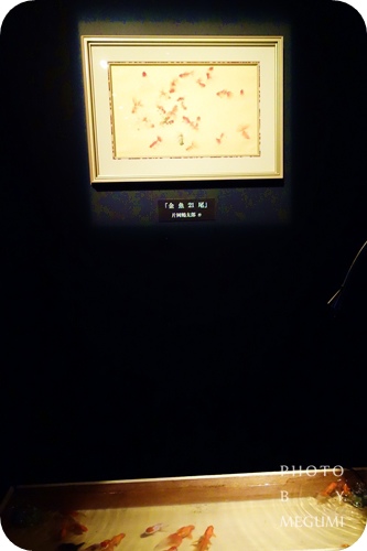 片岡鶴太郎的畫作「金魚21尾」下方,放著21尾金魚悠游