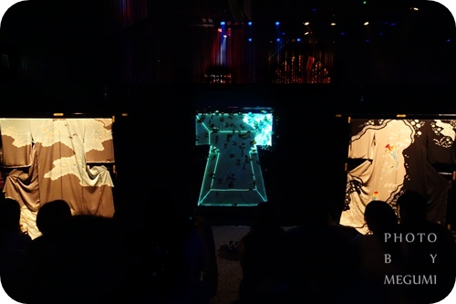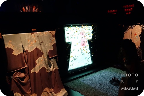 將和服置於水槽底部,再以投影方式呈現出畫面變化的「キモノリウム」,在光線變換中,呈現出千變萬化的風采,雖然不若「水中四季繪卷」叫人讚嘆連連,卻在京都傳統工藝的「京有禪」投影的花色變換與金魚的多彩,勾勒出一幅獨特的畫面。