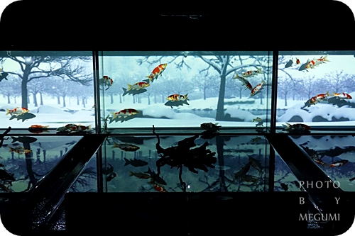 除了立吞之外,「水中四季繪卷」也是不能錯過的重點,雖然因為座椅很少而得站著看,以四季為主題所投影的內容,與悠游水波中的金魚構成一幅獨特的構圖。--而繪卷前的造景與水池也在光影變化裡,折射出更璀璨的繽紛,叫人目不暇給。