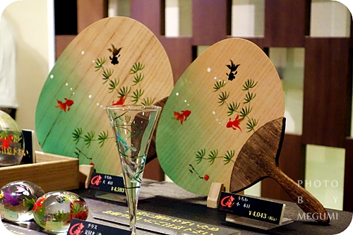 在展場出口,除了設有立吞席之外,還有各種以金魚為主題的周邊商品販售,從會場使用的音樂CD、金魚手帕、金魚團扇、金魚T恤...等各種金魚相關的週邊產品都有,比較特別的是手繪的浮玉(一種可以浮在水上的裝置)、手工江戶風鈴(繪有金魚圖樣)、手工漆繪吊飾(黑底彩繪的吊飾)這幾項商品。只要您有鈔票就不怕沒東西買,小到兩片100円銅板明信片、貴到日幣近5000円的手繪漆飾通通都有,來客的荷包可要小心看緊啊!
